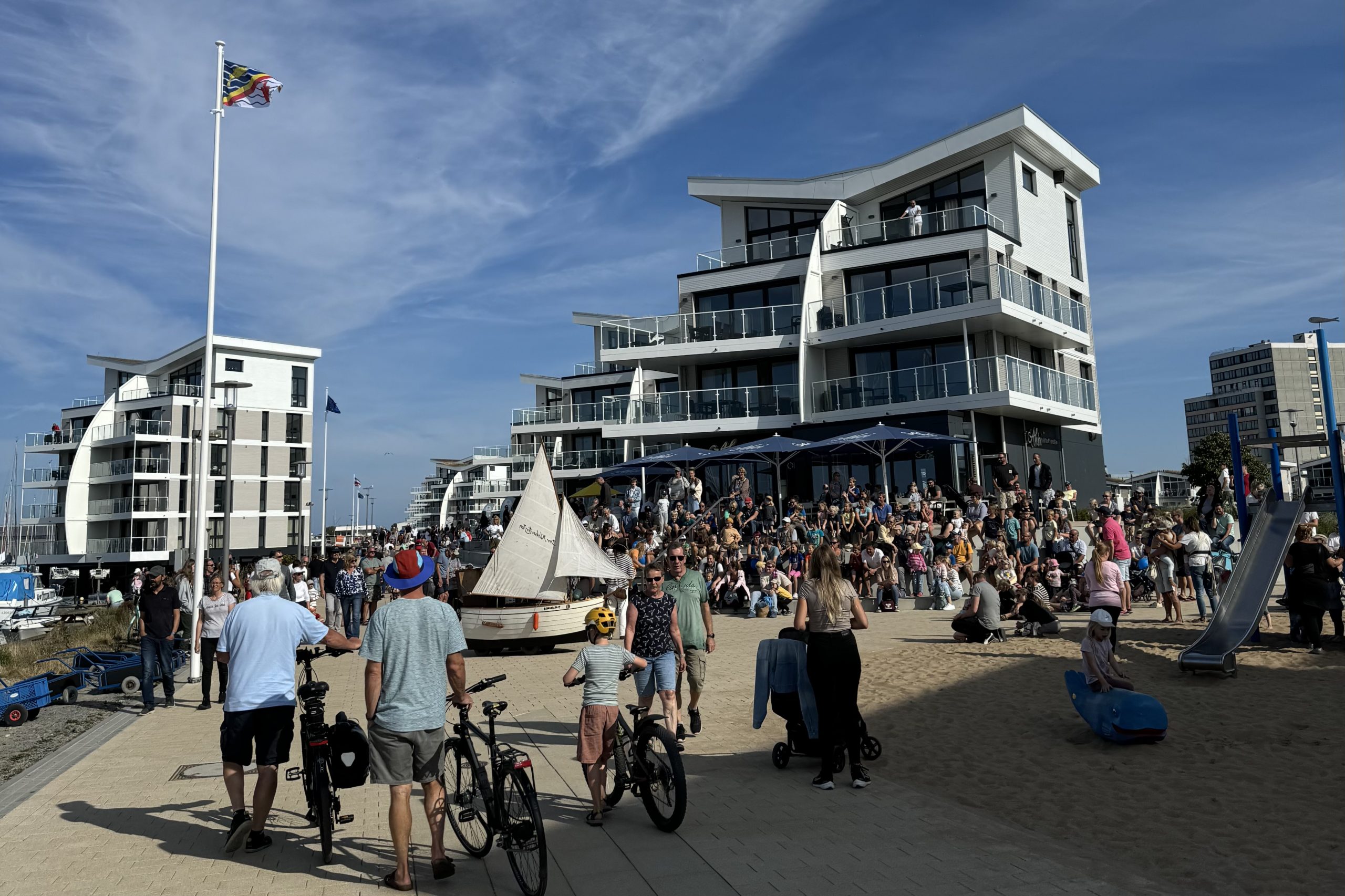 Auf der neuen Erlebnispromenade kann man das maritime Flair genießen und den Blick über das Wasser, die Natur und den Hafen schweifen lassen. Kinder kommen auf den drei Spielplätzen voll auf ihre Kosten und erklimmen den Dorschkönig.